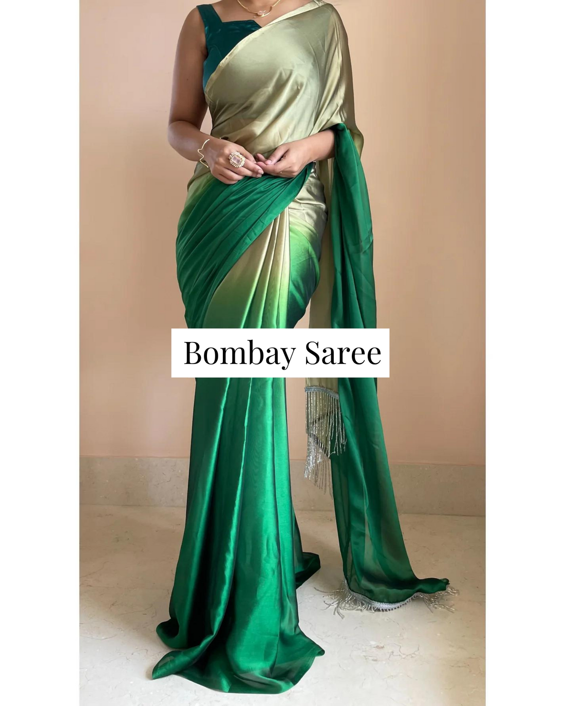 Green Hedge Ombre Satin Saree with Handmade Tassels on Pallu