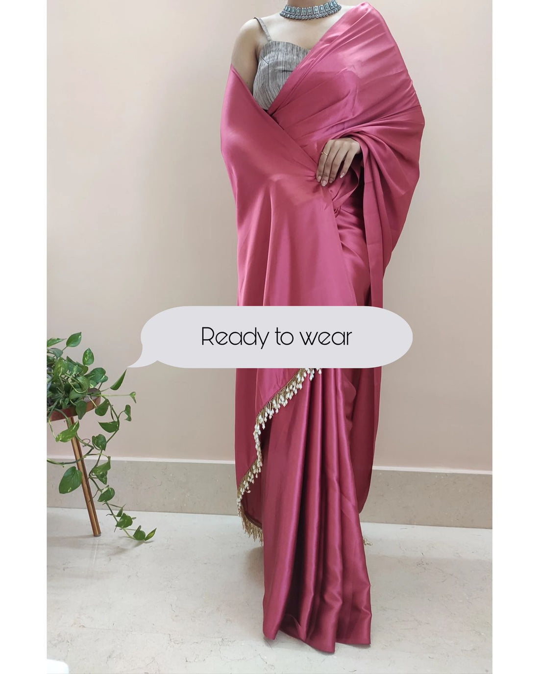 1-MIN READY TO WEAR Rose Pink Satin Silk Saree With Handmade Tassels On Pallu