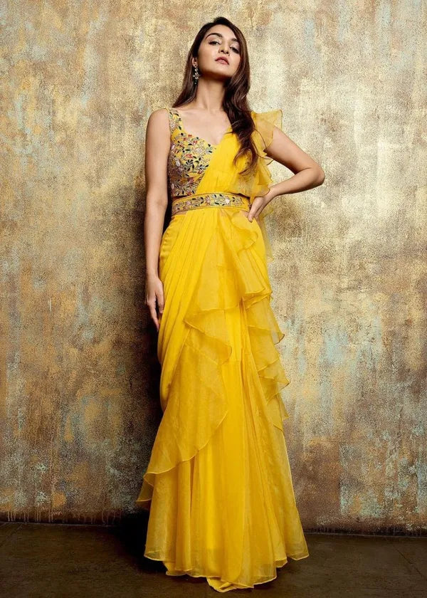 PRODUCT DESCRIPTIONSaree : Ready to wear saree in premium imported silkStyle : Party Wear Saree/function lookWork : beautiful...