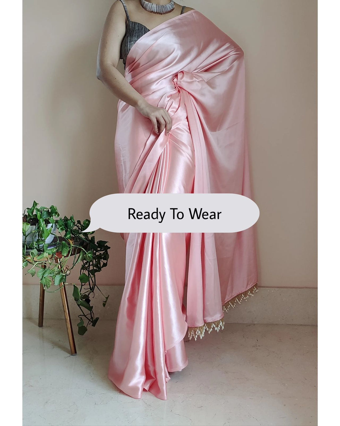 1-MIN READY TO WEAR Peach Satin Silk Saree With Handmade Tassels On Pallu