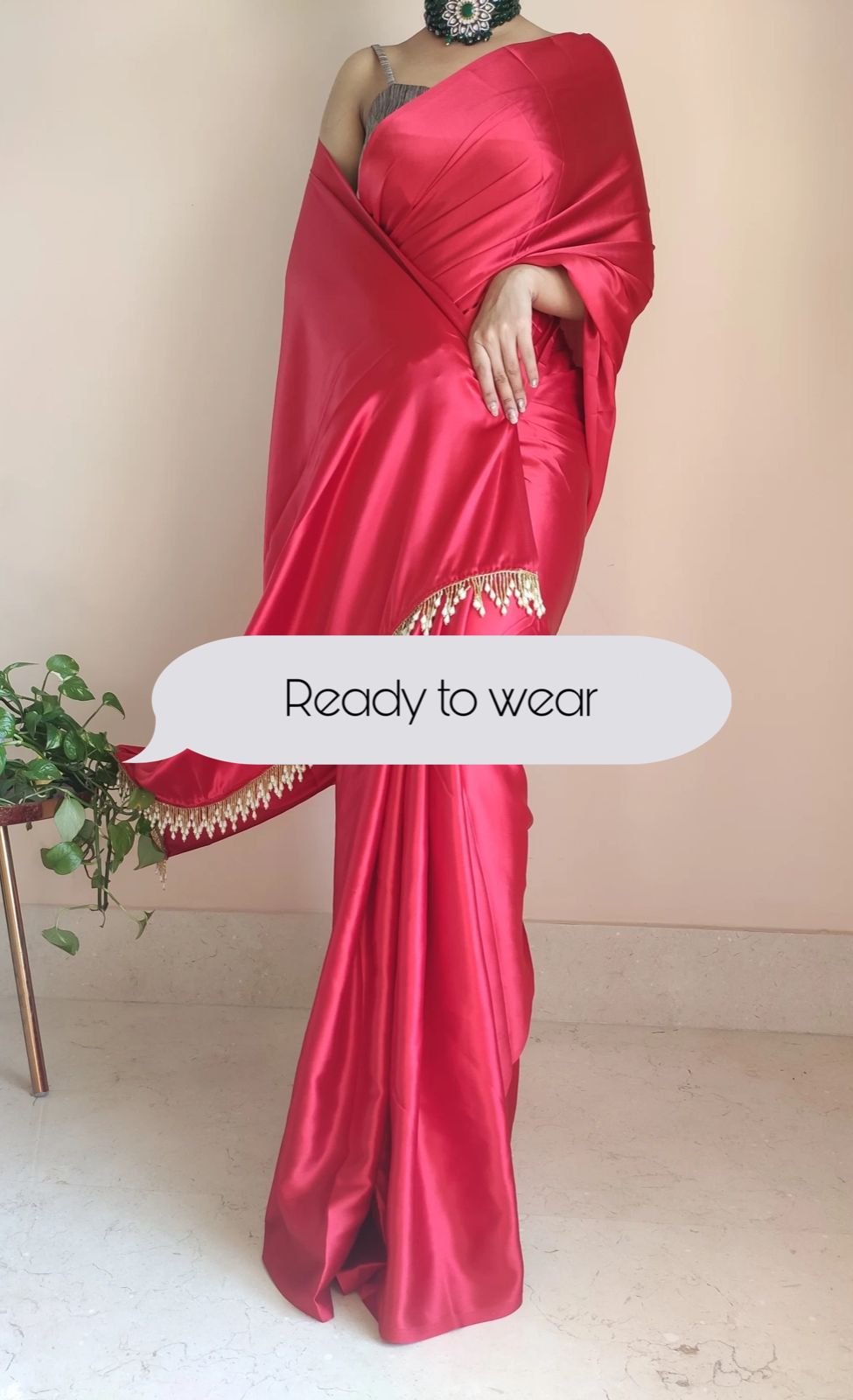 1-MIN READY TO WEAR Tomato Red Satin Silk Saree With Handmade Tassels On Pallu