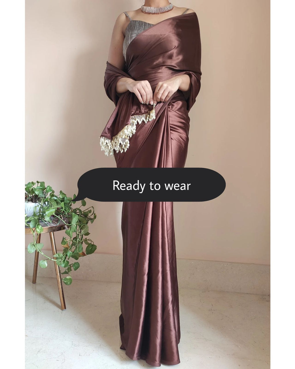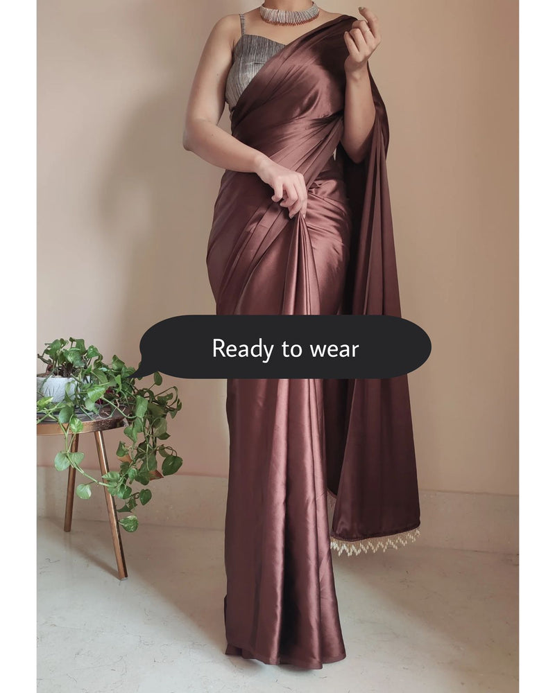 1-MIN READY TO WEAR Coffee Brown Satin Silk Saree With Handmade Tassels On Pallu