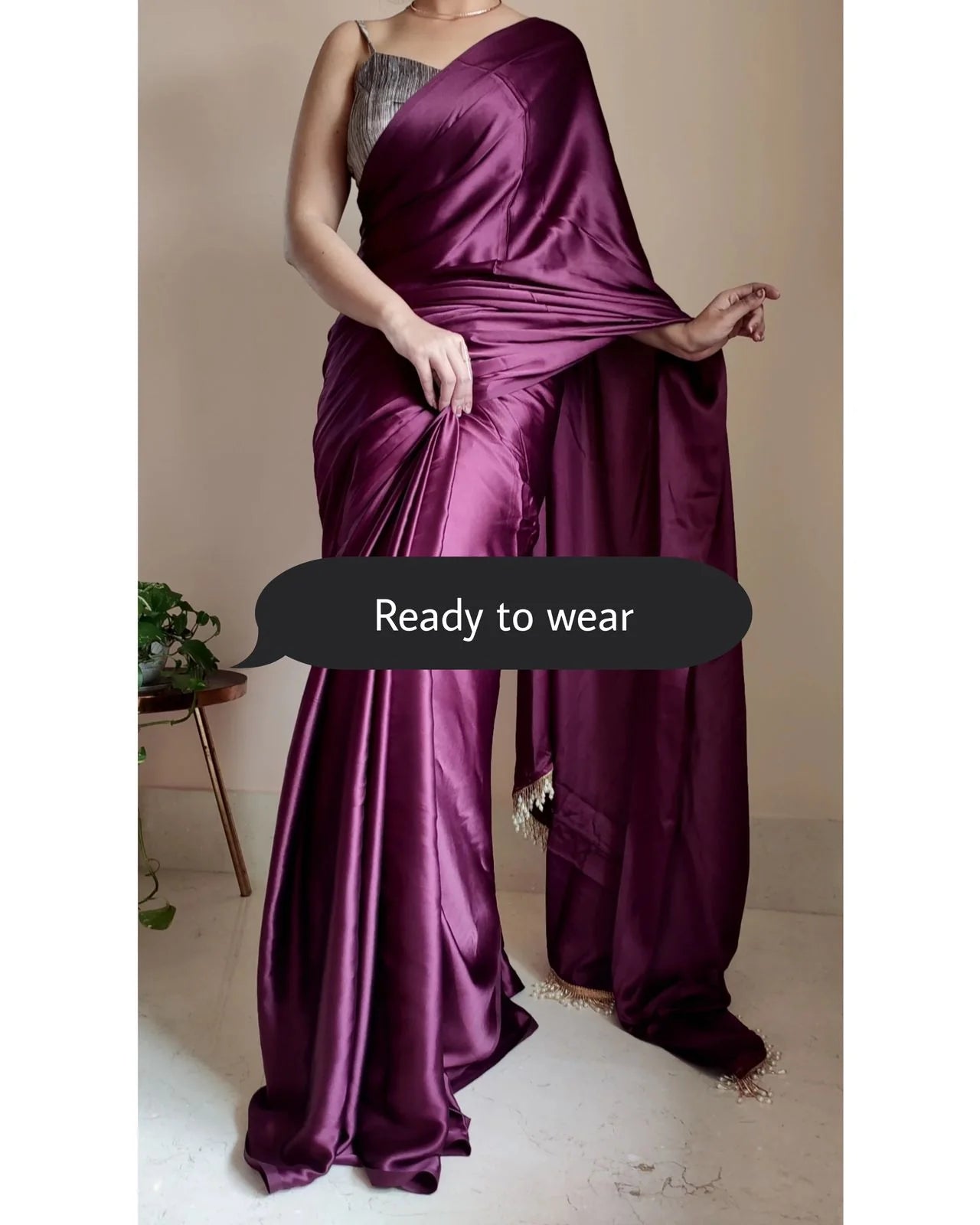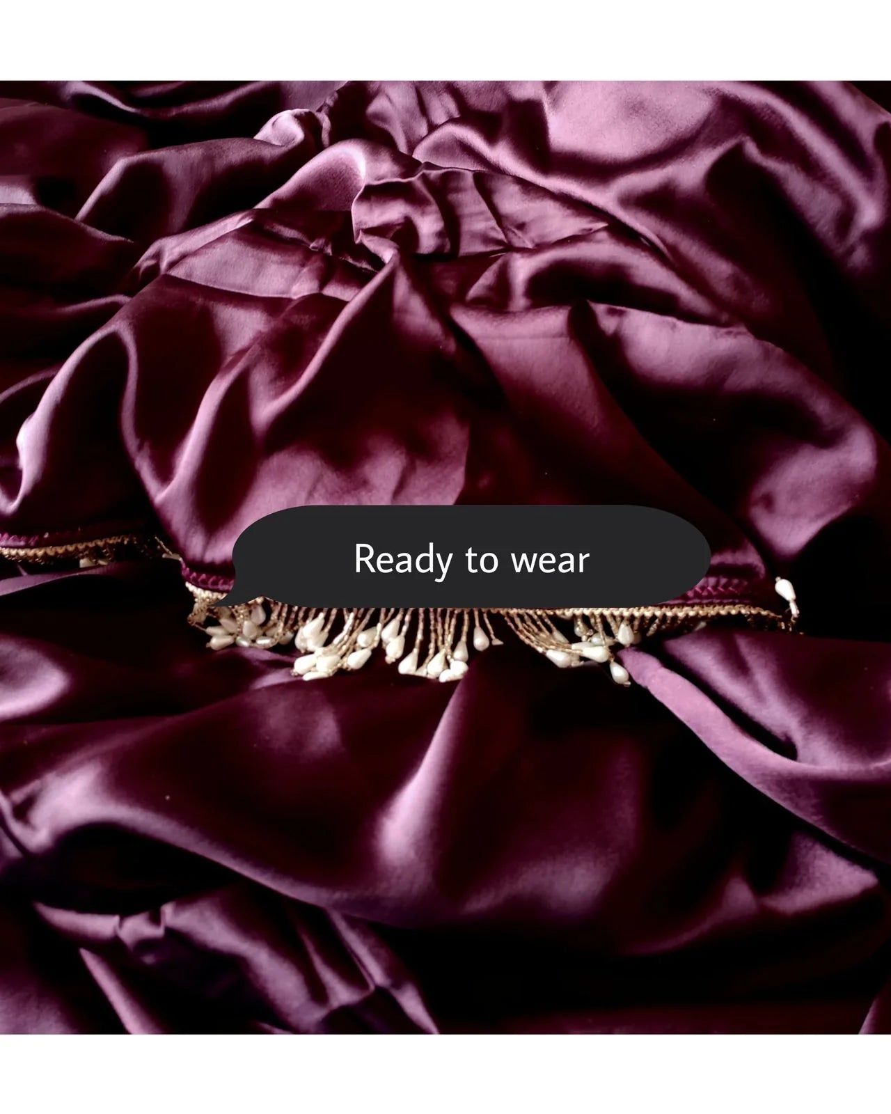 1-MIN READY TO WEAR Dark Eggplant Wine Satin Silk Saree With Handmade Tassels On Pallu
