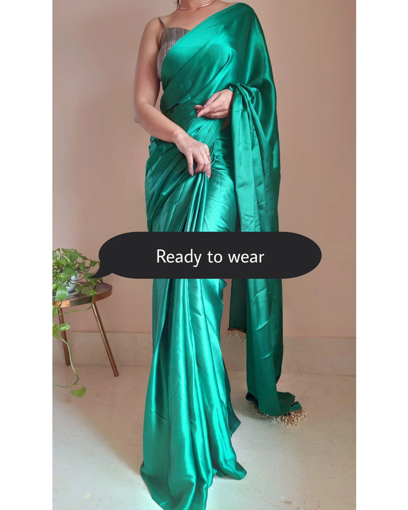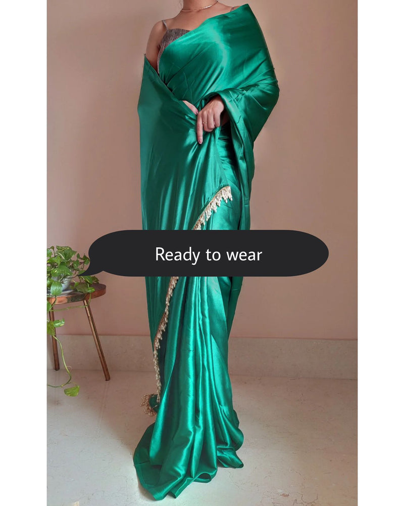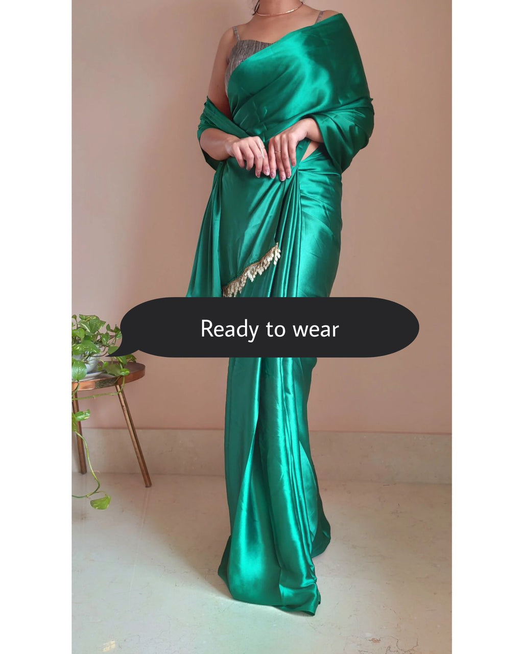 1-MIN READY TO WEAR Jade Green Satin Silk Saree With Handmade Tassels On Pallu