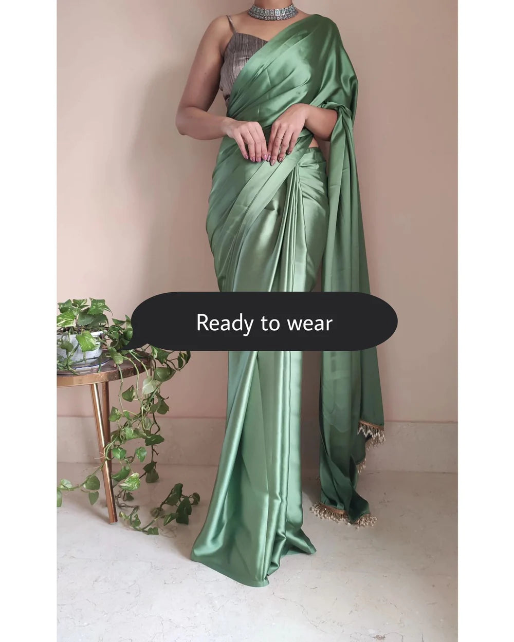 1-MIN READY TO WEAR Moss Green Satin Silk Saree With Handmade Tassels On Pallu