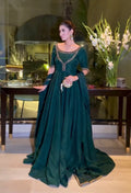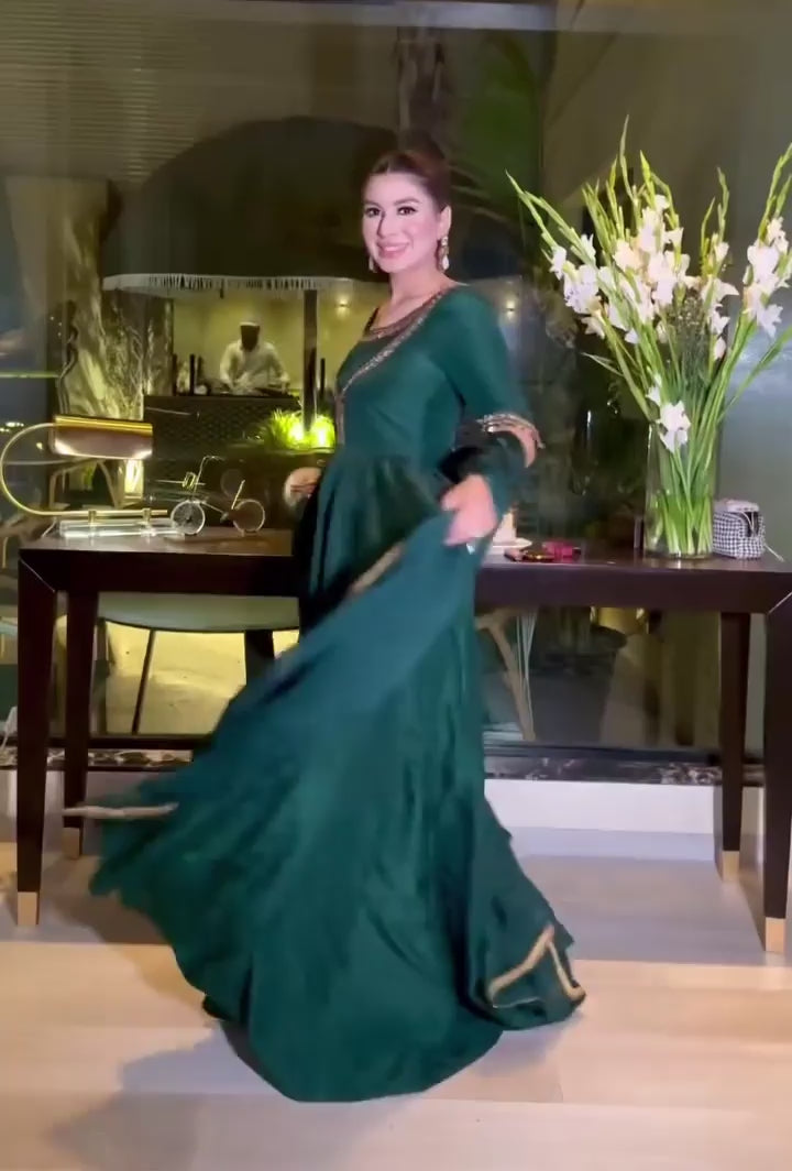 Serve elegance with this gorgeous Anarkali gown crafted in georgette fabric and detailed with sequins, zari, and thread work. The gown features a rich 7.5 meter flair for a graceful and flowy look. It is paired with a crepe silk pant with elastic waist and a matching georgette dupatta with border work, making it a complete ready-to-wear ethnic set.