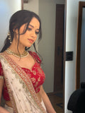 This designer saree is made from faux georgette and styled with detailed embroidery using 5mm sequins, silver and jari dori work. It features a lace border highlighted with real mirror work, giving the saree a rich and festive look. The solid base with embroidery makes it suitable for occasions like sangeet and cocktail parties.