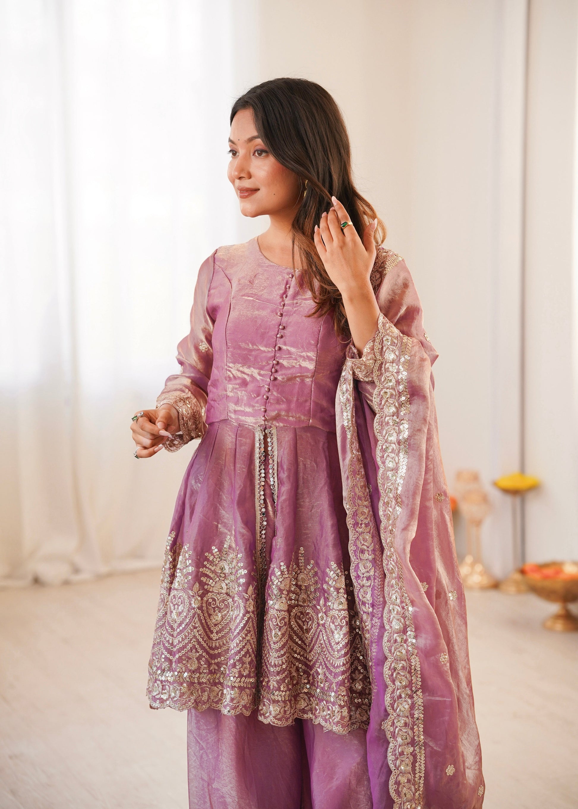 Designer Two-Tone Fandy Silk Top Palazzo Set with Embroidery & Dupatta