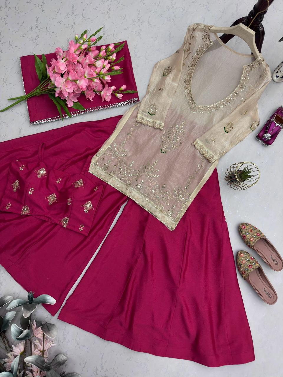 A stylish 4-piece designer party wear set crafted with rich fabrics and detailed embroidery. Perfect for festive occasions and celebrations, this collection blends elegance with comfort and premium finishing.