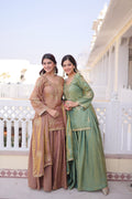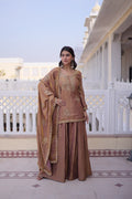 A premium designer ready-to-wear top sharara dupatta set crafted in rich Fendi Crush fabric, beautifully enhanced with zari sequins embroidery work. Designed with full cotton lining for comfort, this elegant outfit is perfect for festive gatherings and party wear styling.