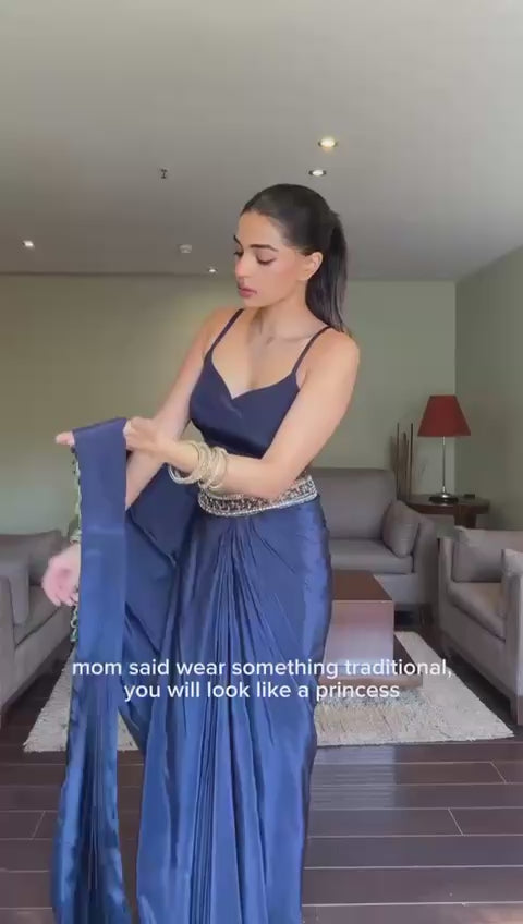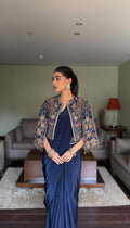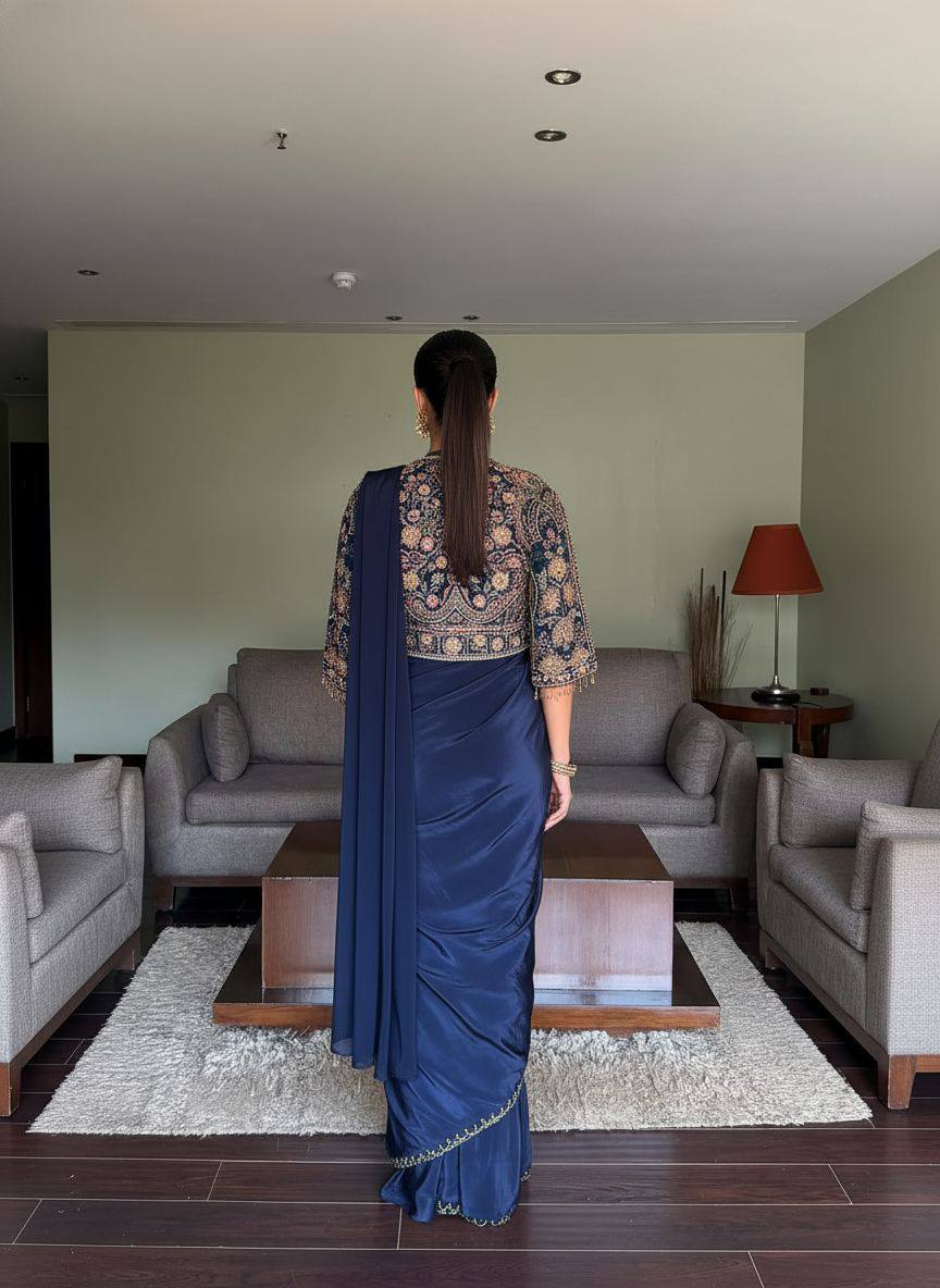 A stylish ready-to-wear lehenga saree set designed in premium Chinon silk, featuring a beautifully embroidered jacket/koti with zari and thread work. The look is completed with a plain blouse and an elegant lehenga saree finished with fancy samosa lace on the pallu—perfect for festive and party occasions.