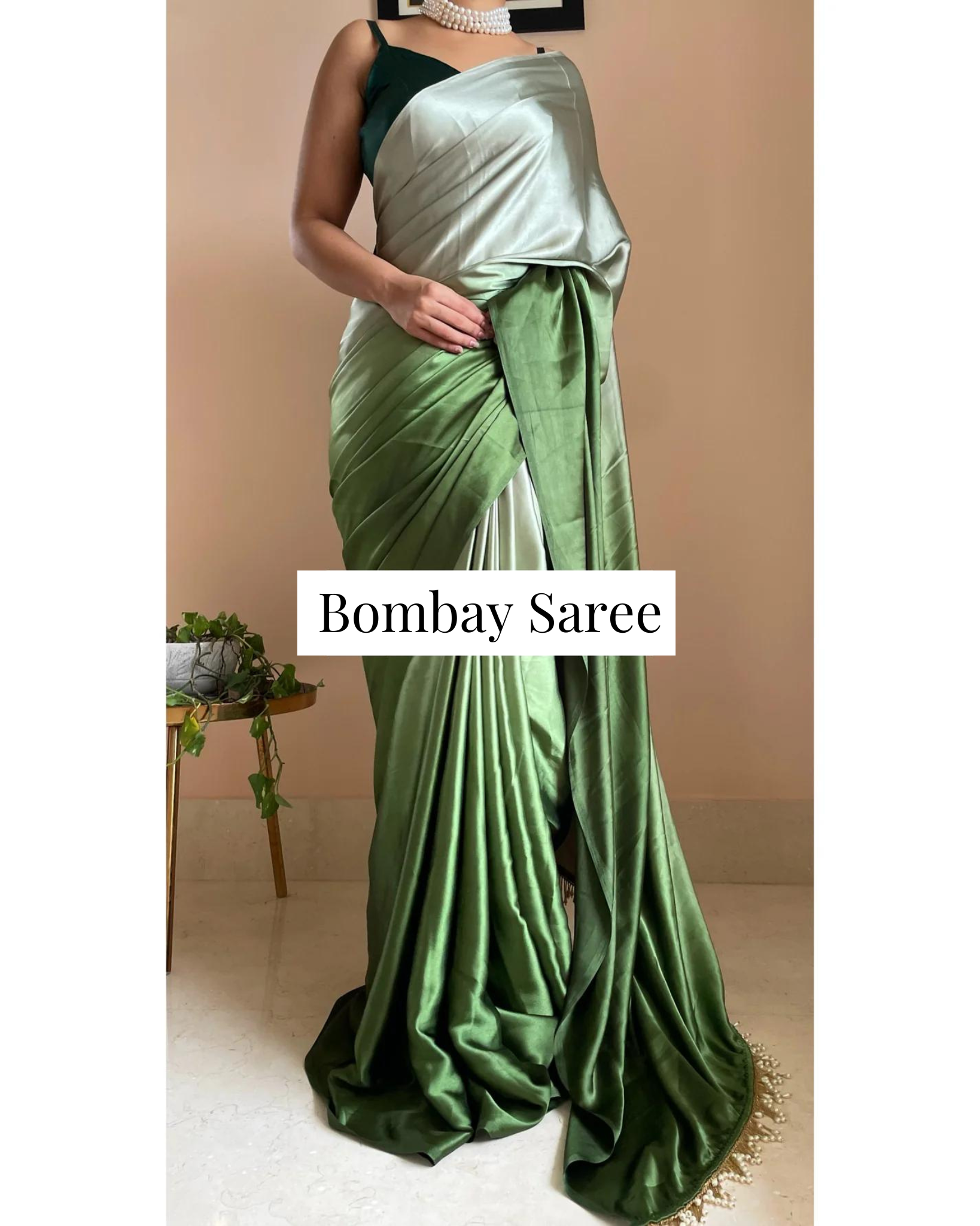 Green Hedge Ombre Satin Saree with Handmade Tassels on Pallu