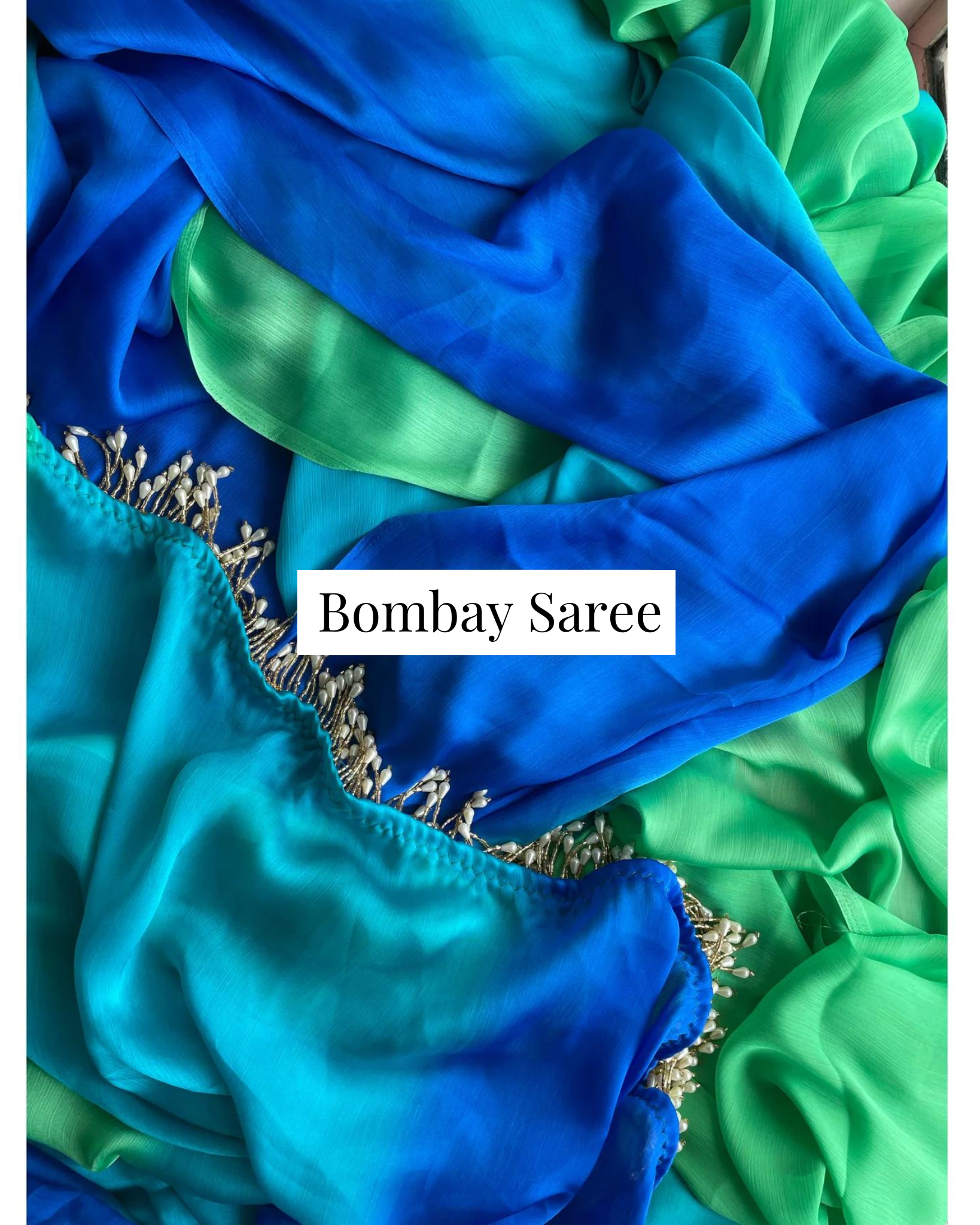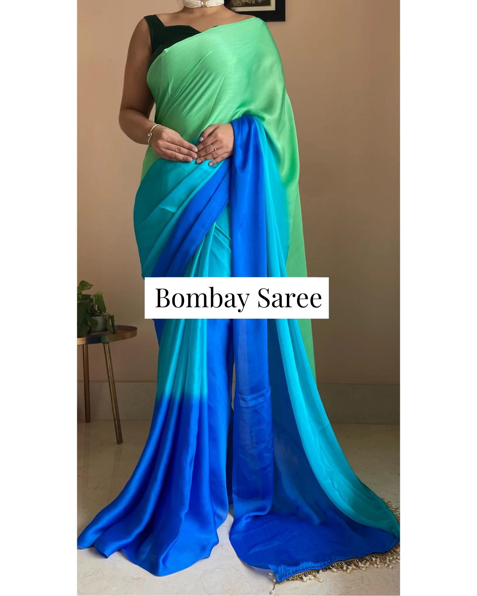 Neela Ambar Ombre Satin Saree with Handmade Tassels on Pallu