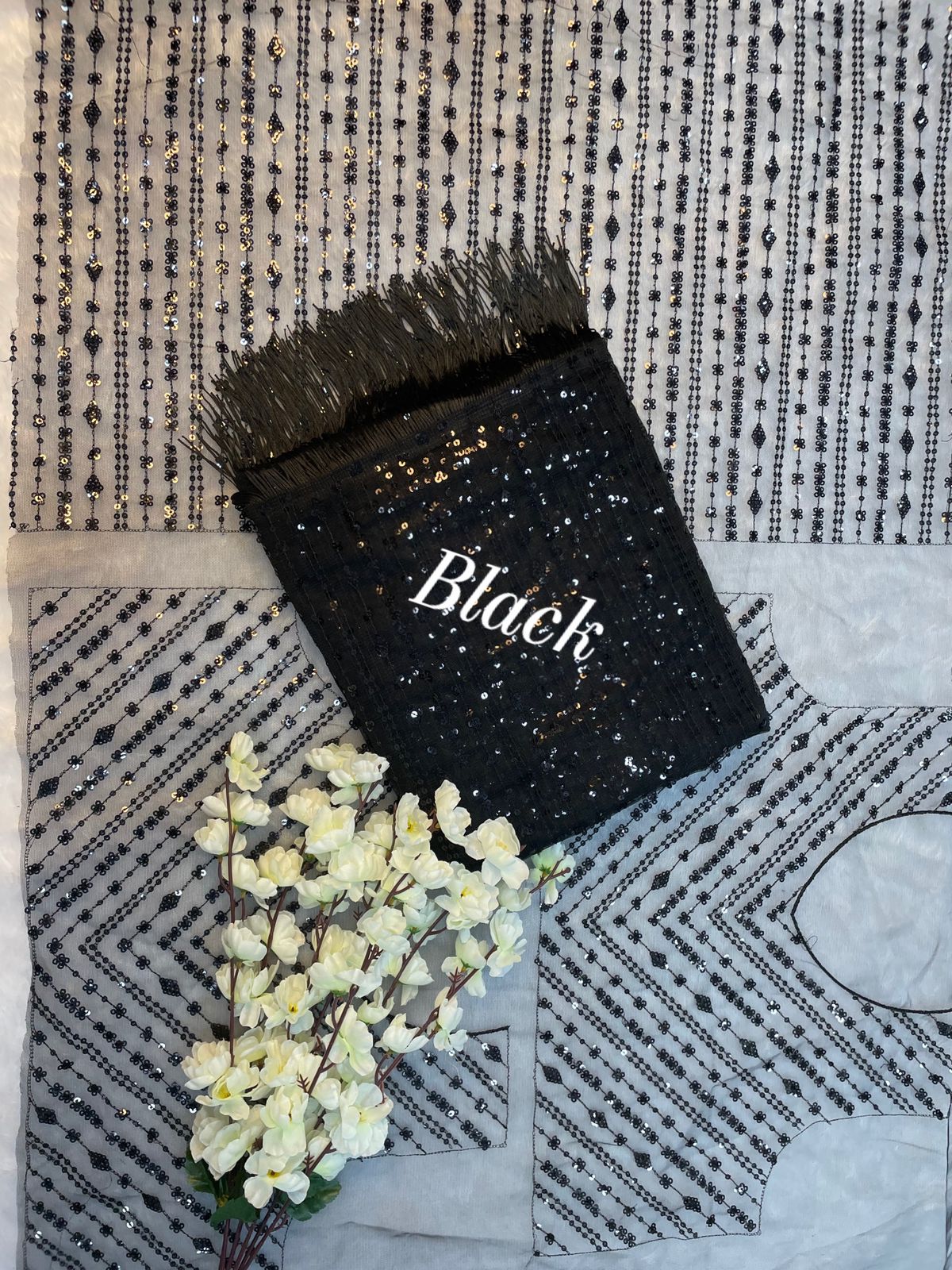Fabric :- Georgette WORK :- Dual shade Sequence work with back patch lace border and piping |