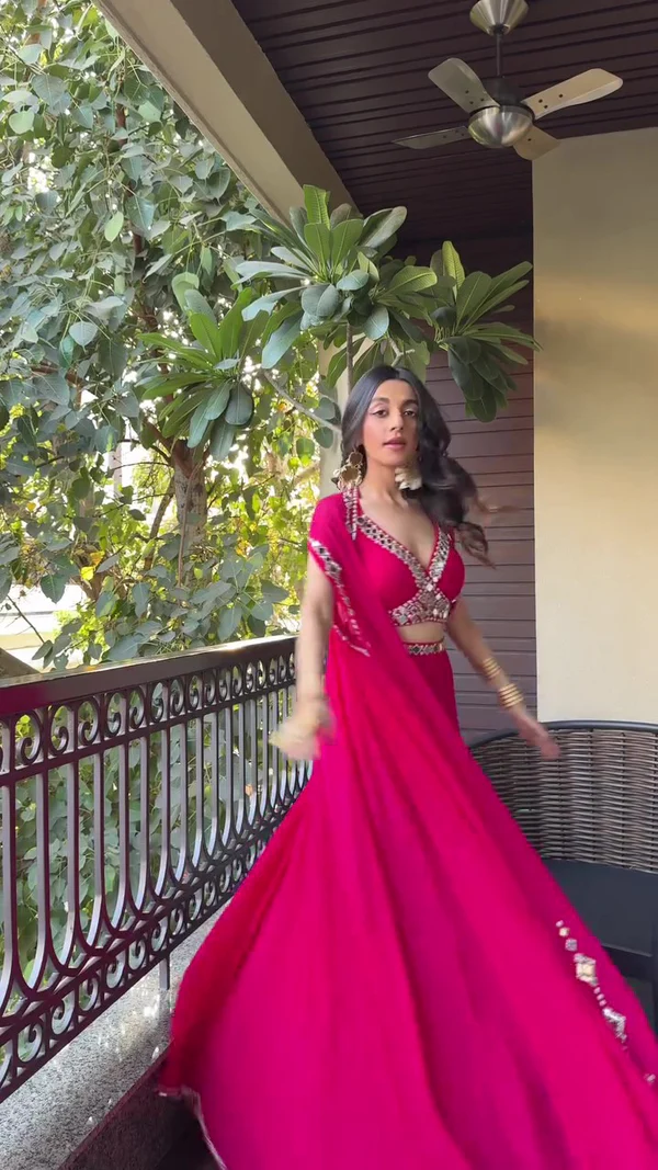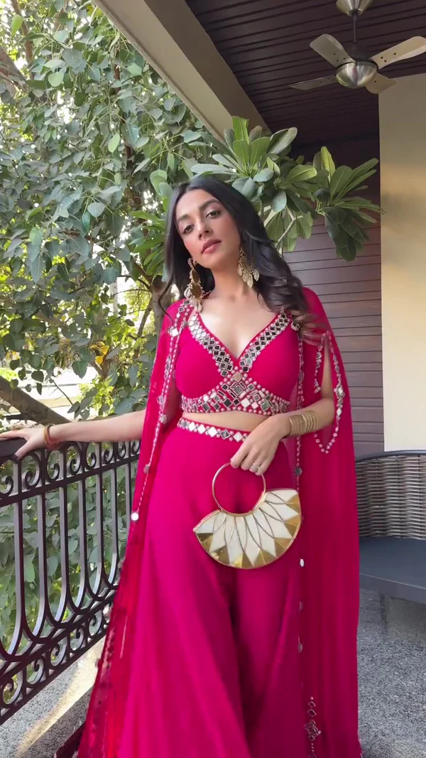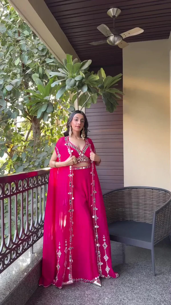 Newly launch Pink Draped plazo & Mirror work Blouse with Cape