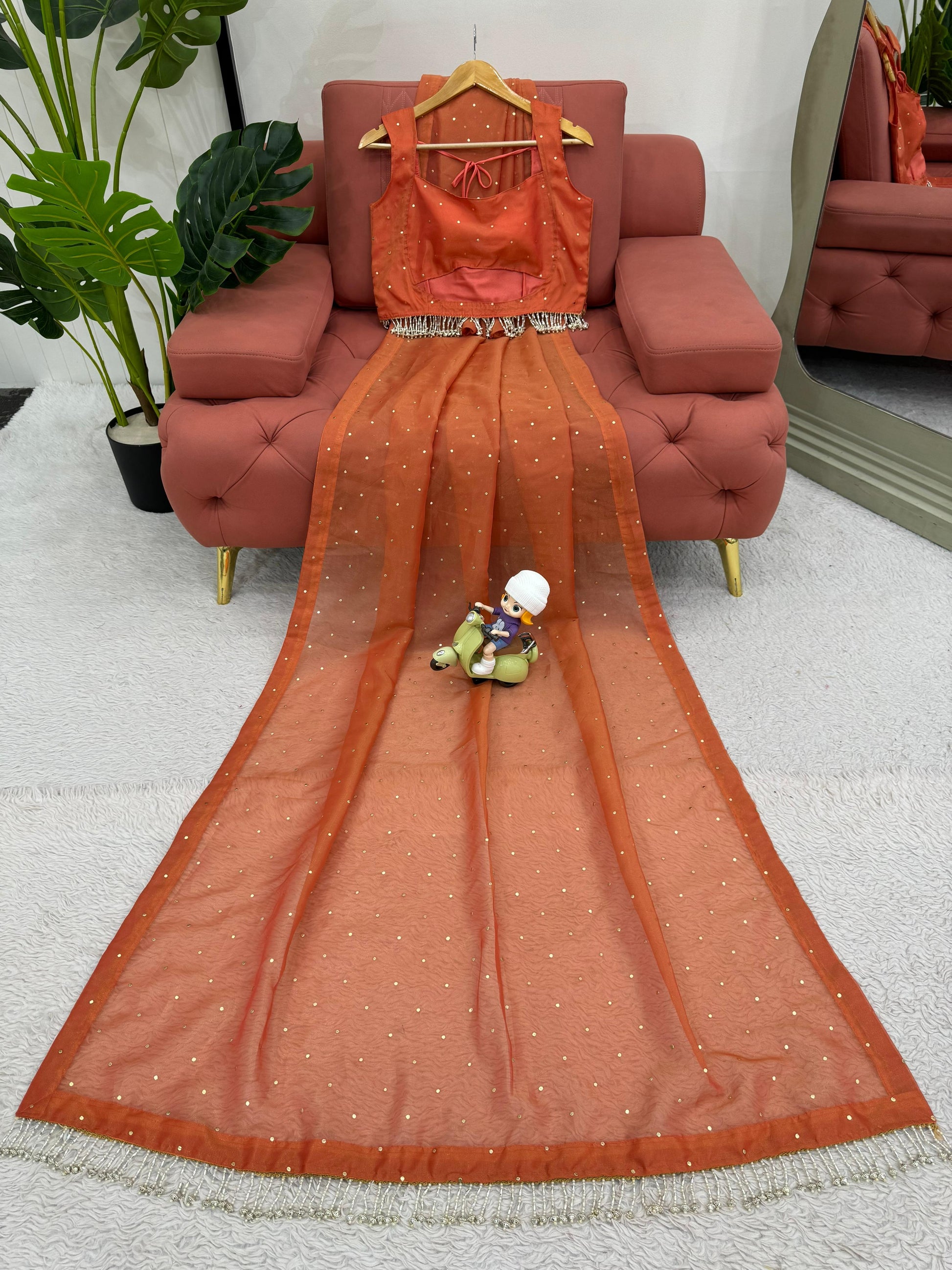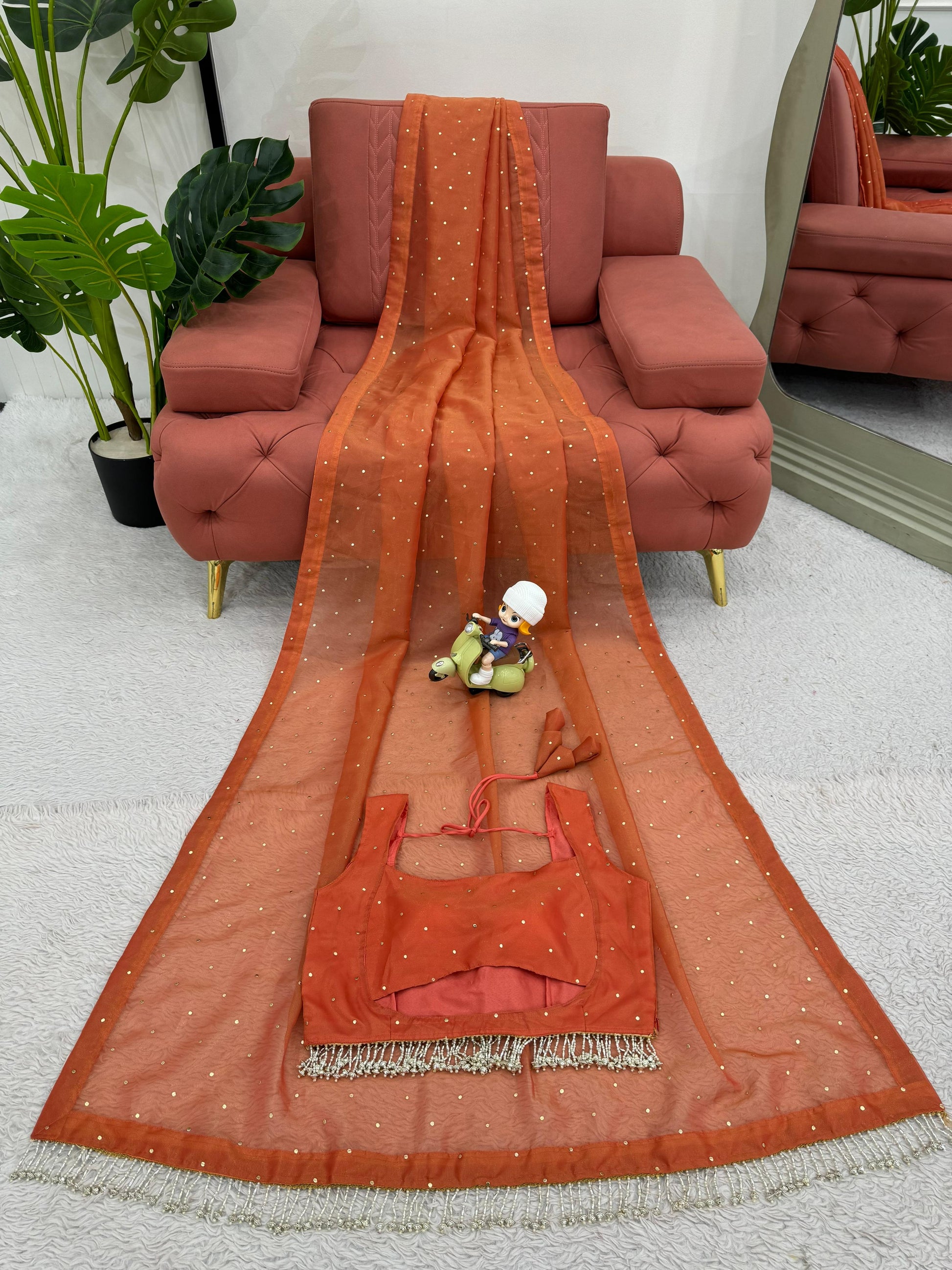 Rust orange beautiful Designer Saree on Chimar Tissue Silk Febric