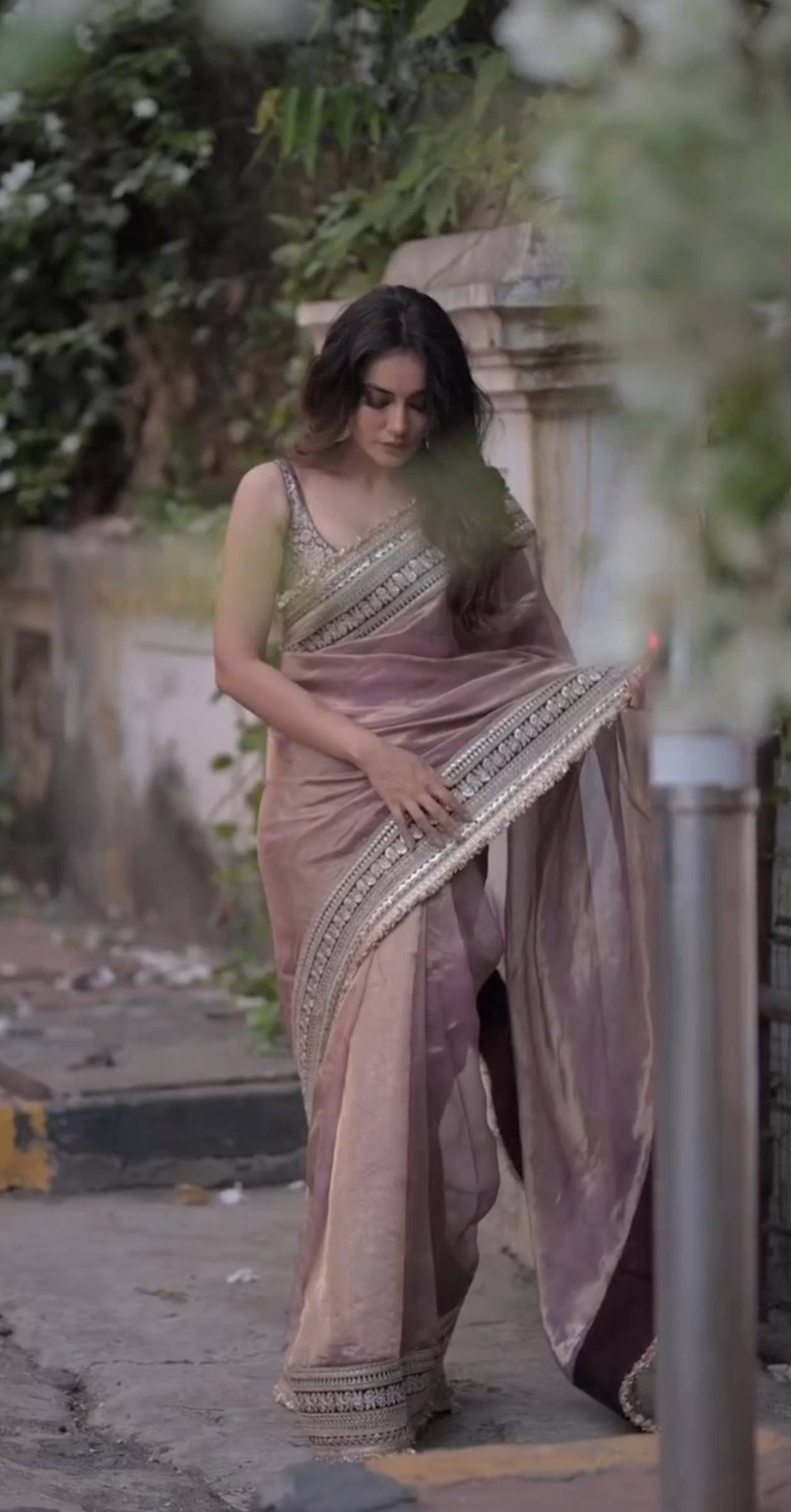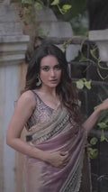 The sparkling beauty of this contemporary saree lies in the intricate handcrafted embellishments running across the drape.