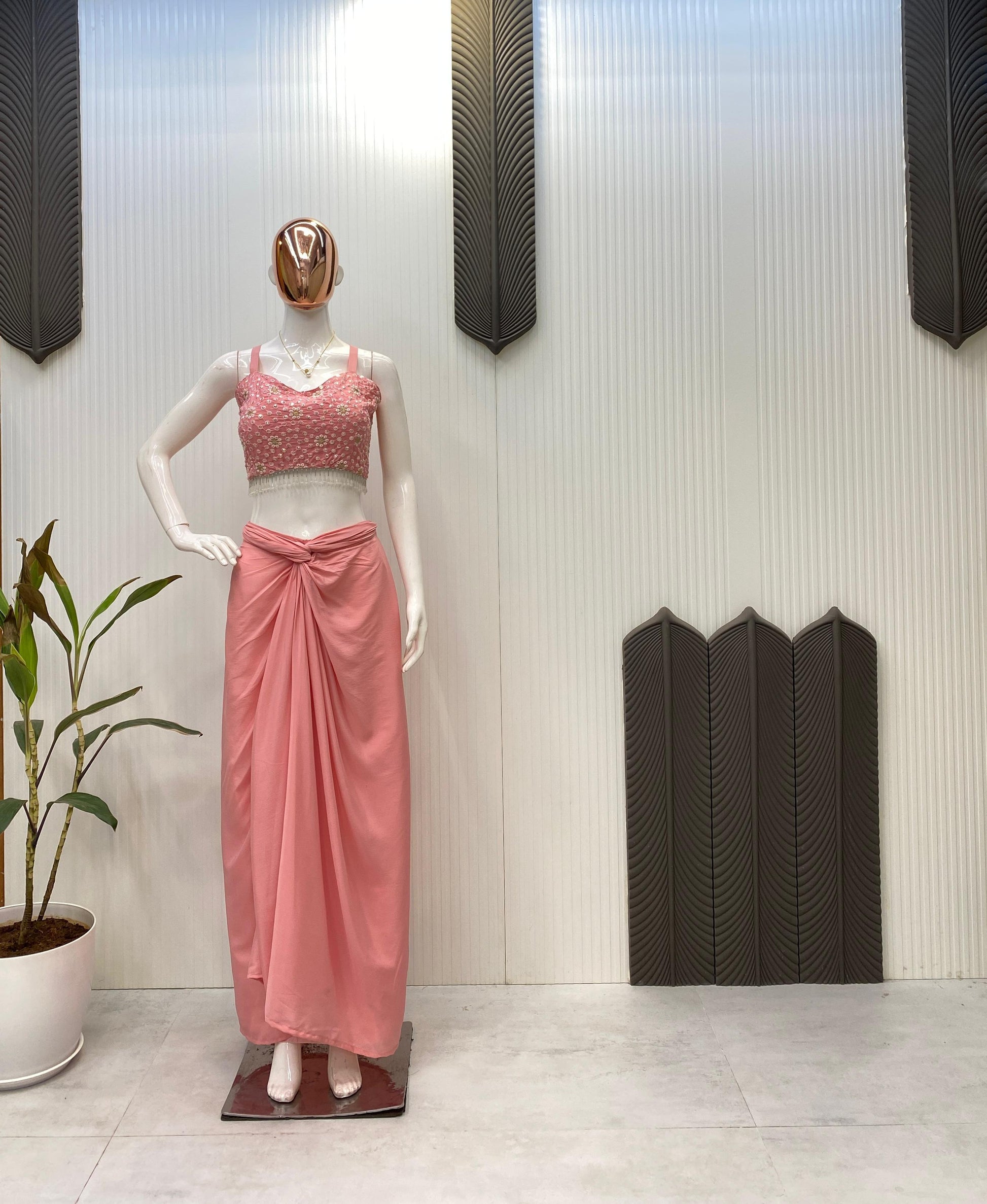 TUBE BLOUSE:FRENCH CRAPE WITH SEQUENCE EMBROIDERY AND SILVER MOTI LACE