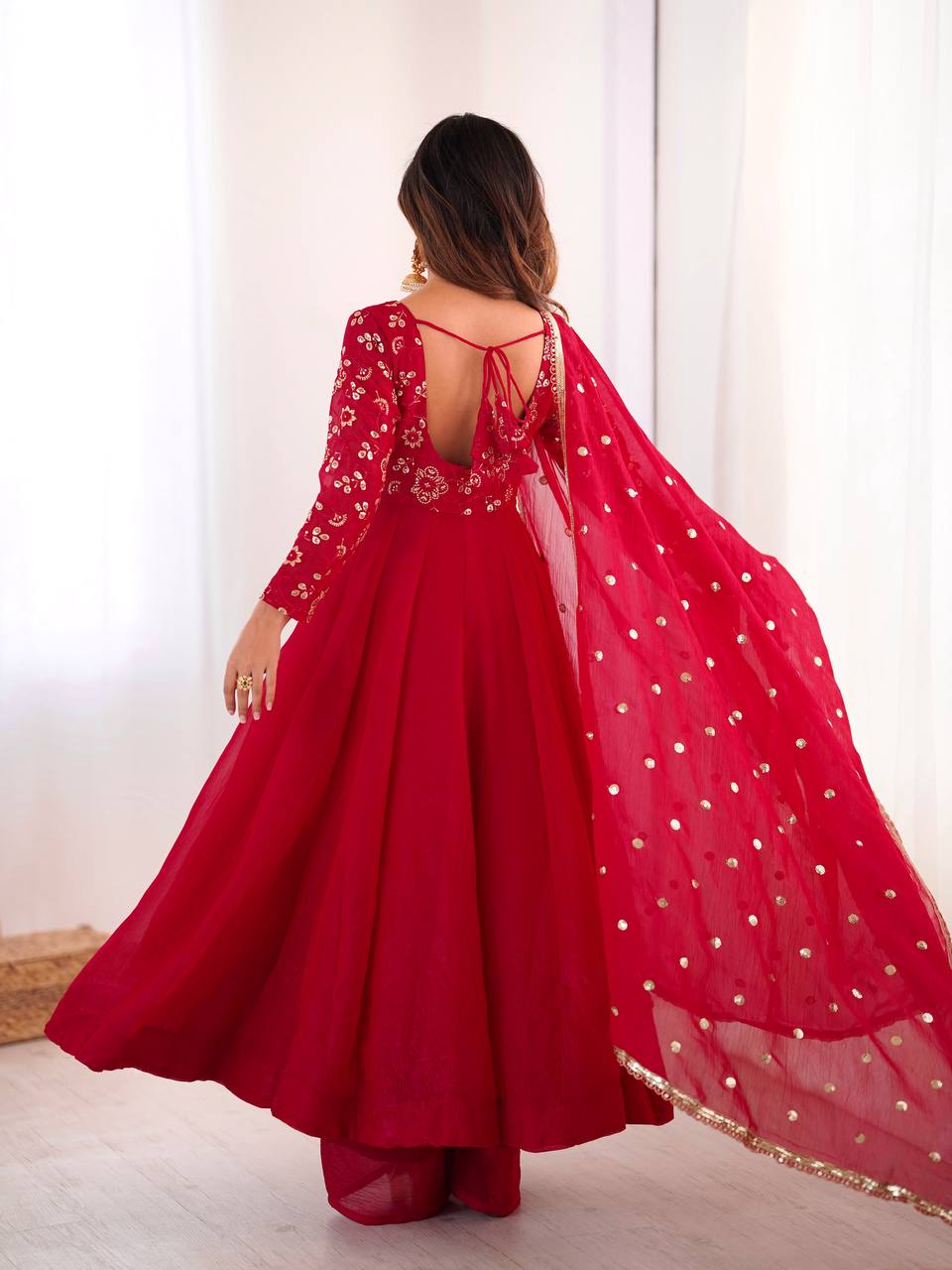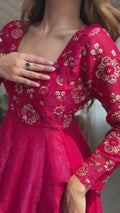 A premium ethnic gown set crafted in crunchy silk, designed to deliver a graceful and festive look. Featuring a fully flared gown with lace border detailing, paired with a matching pant and embroidered dupatta, this ensemble offers elegance and comfort for occasion wear.
